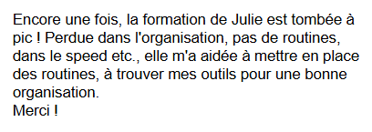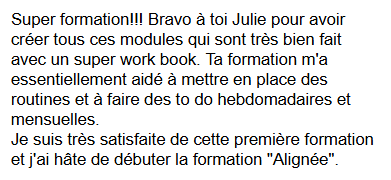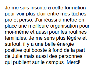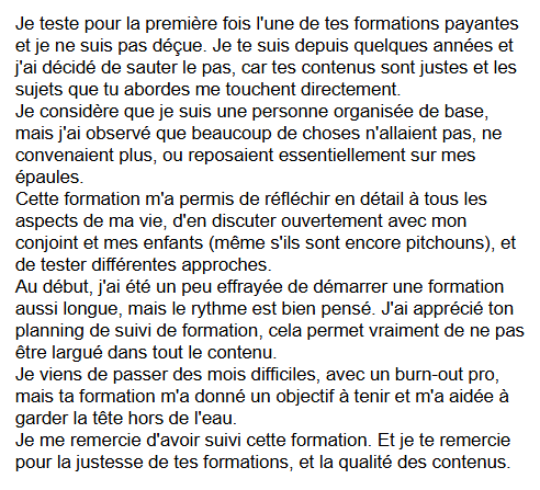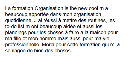 Si vous avez une organisation qui vous convient, qui vous permet de vous sentir serein.e et de dégager du temps et de l’énergie pour les choses importantes pour vous, alors bravo ! Cette formation n’est effectivement pas pour vous 😉
