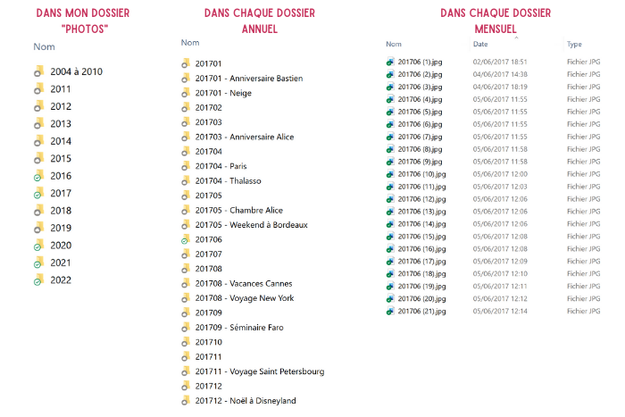- et éventuellement des dossiers à part pour les événements marquants (voyage, anniversaire, mariage…).