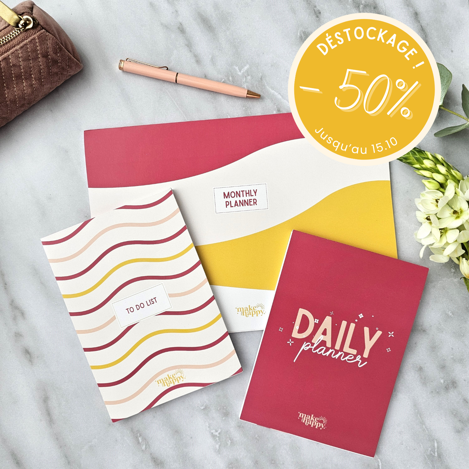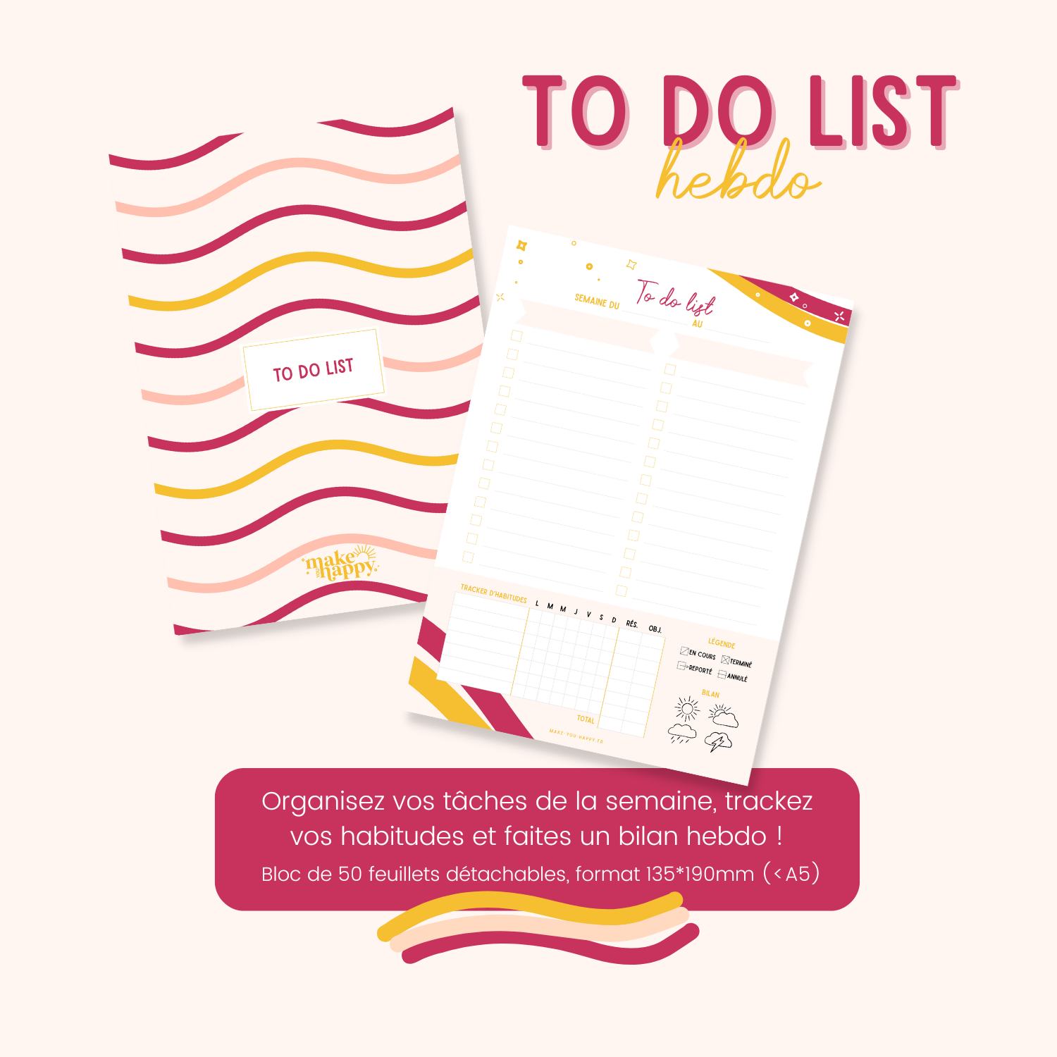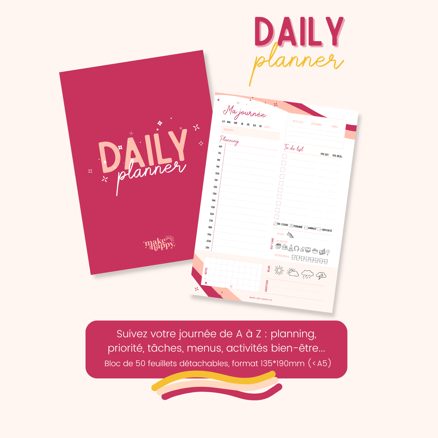 - Dimensions Daily Planner et To do lists : 13,5 x 19 cm x 0,7cm (légèrement plus petit qu’un A5)
